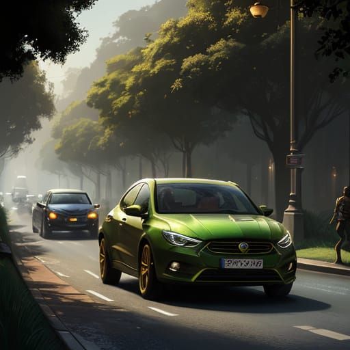 This image shows a car on a vibrant African road at golden hour, with people walking nearby. The fantasy art style features lush foliage, warm streetlights and deep shadows.