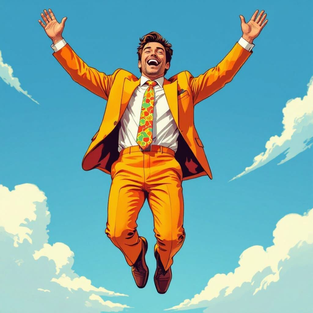 This digital art shows a man in a bright orange-yellow suit jumping joyfully in the air, hands raised against a blue sky. Inspired by comic art and pop art, it features bold lines and vivid colors.