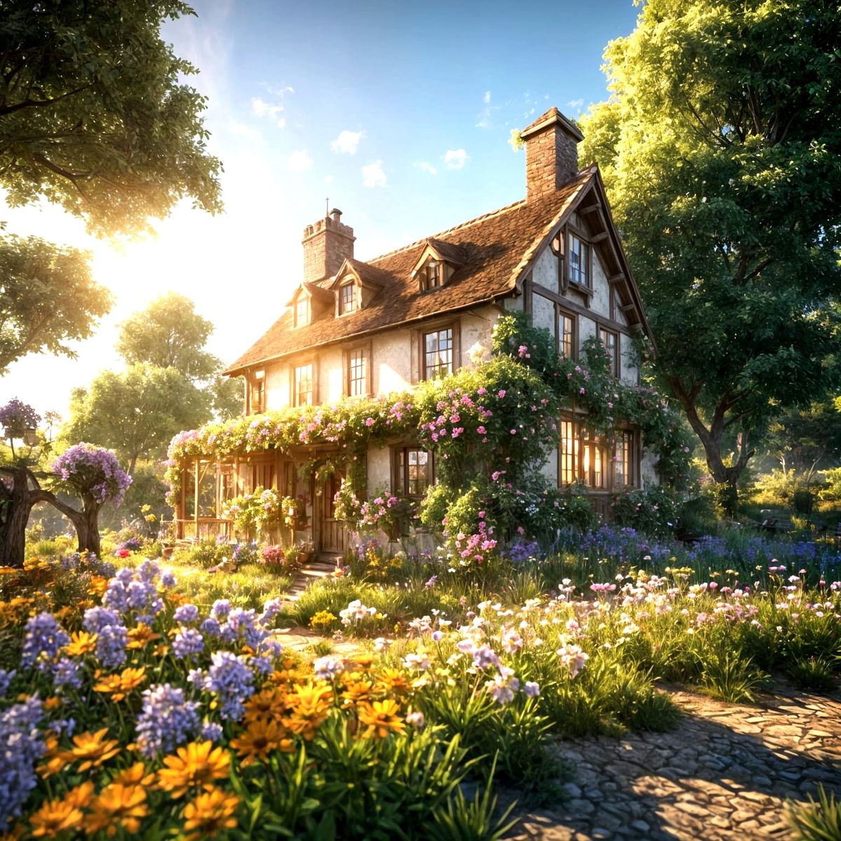 This image showcases a charming cottage bathed in sunlight, surrounded by a vibrant wildflower garden. Rendered with stunning 3D game graphics, it features dynamic lighting and intricate detail for an epic visual experience.