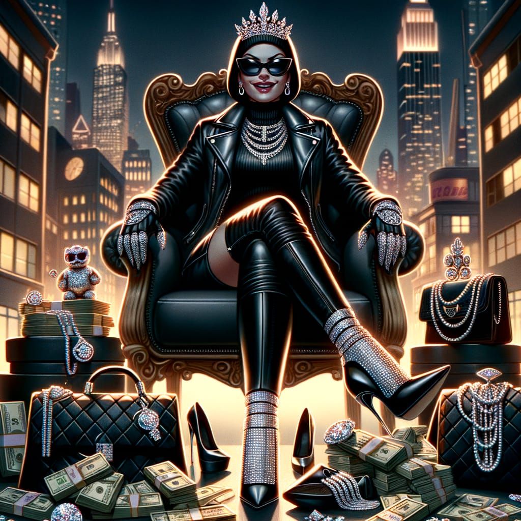 This image shows a mysterious, leather-clad crime boss on her throne. Adorned with diamonds and designer accessories, she's surrounded by tributes from her followers in this striking digital art piece.