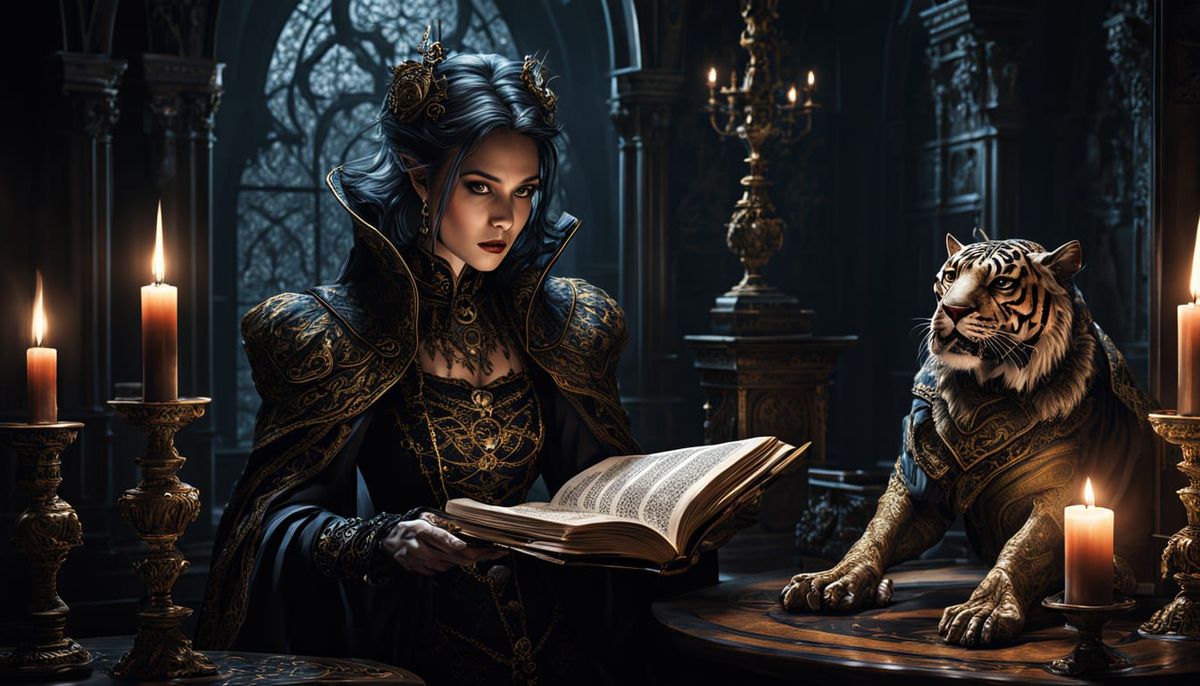 A striking picture of a Victorian vampire sorceress levitating a grimoire in an opulent parlor. Shimmering energy surrounds her and a saber-toothed tiger in this dark fantasy illustration with a comic book art style.