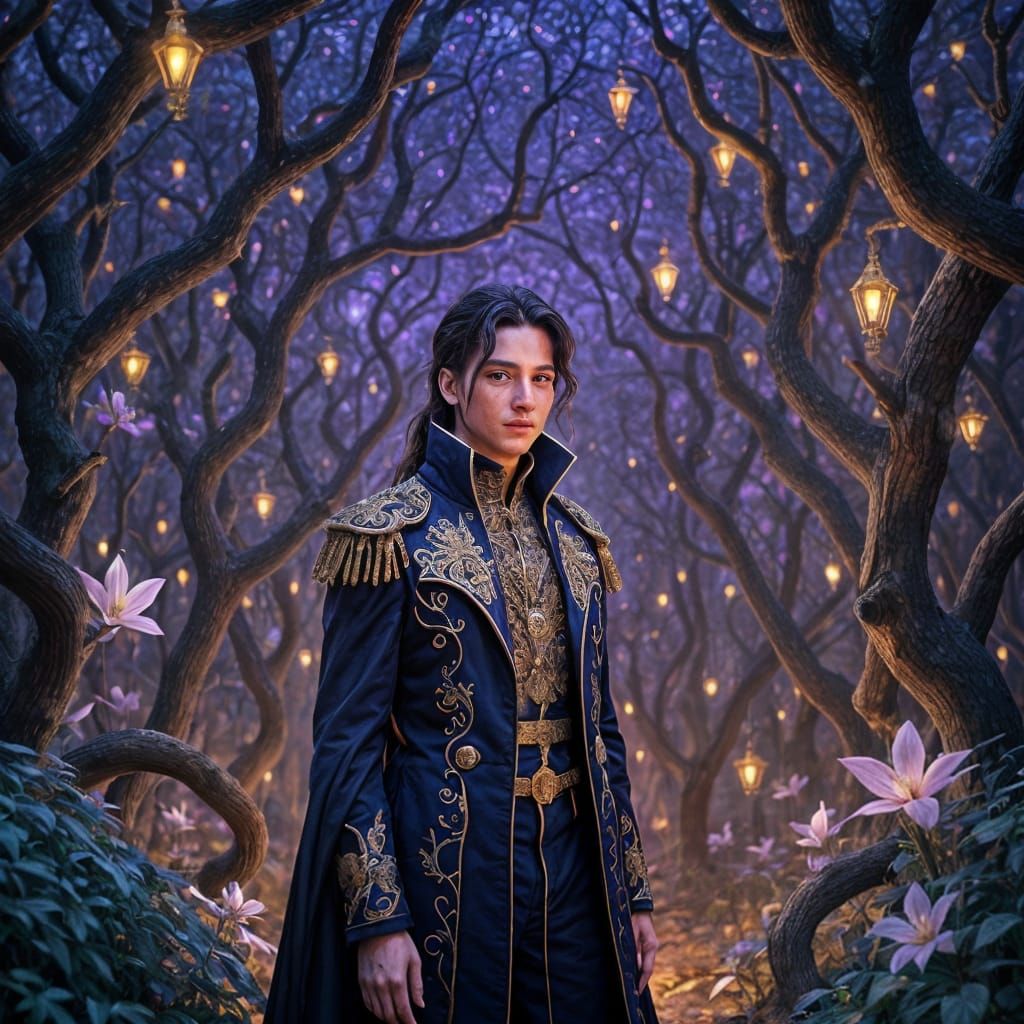 This image shows a charming prince in ornate baroque clothing, lost in a magical, disorienting forest. The vibrant anime style features dramatic lighting and rich colors, evoking fairy tale adventure.