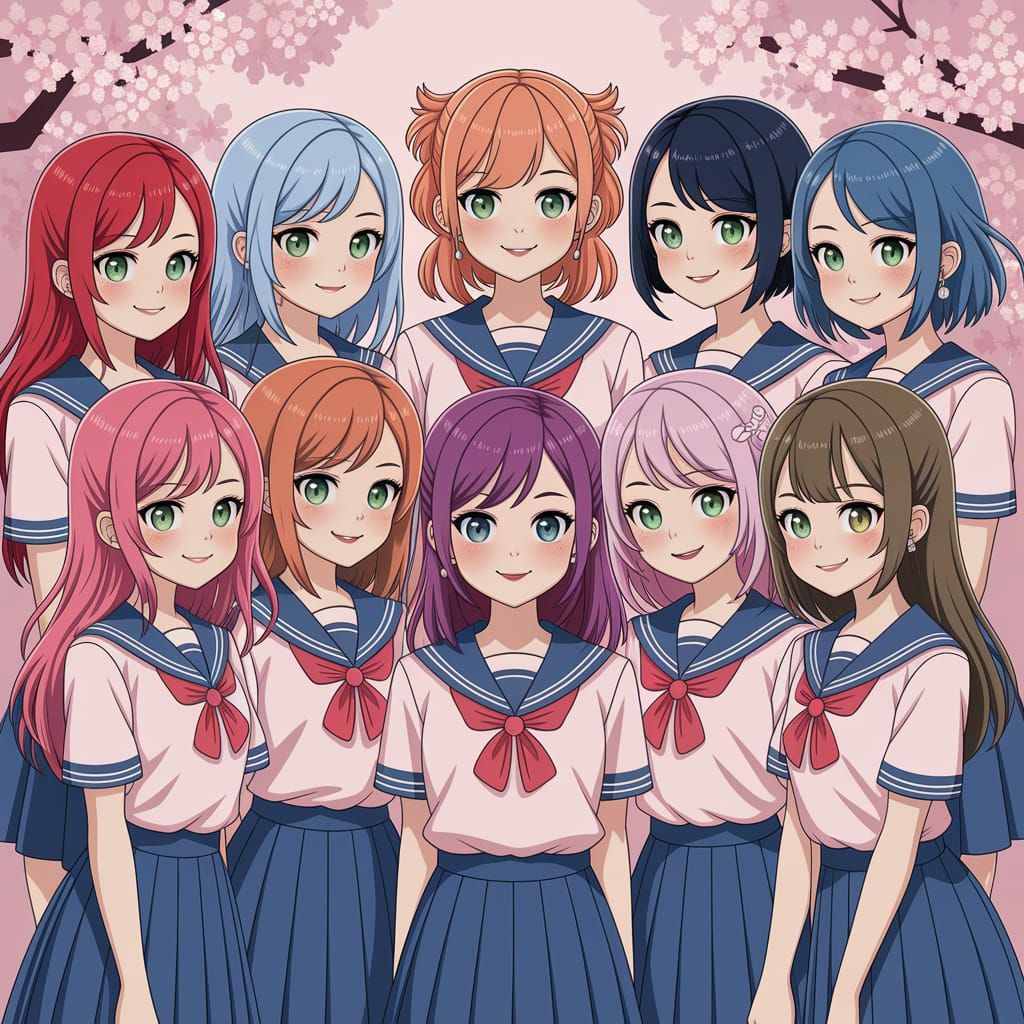 This image shows a group of eight young women students standing together in a charming portrait, set against a backdrop of blooming cherry blossoms in full spring splendor. Soft, warm hues create a serene atmosphere.