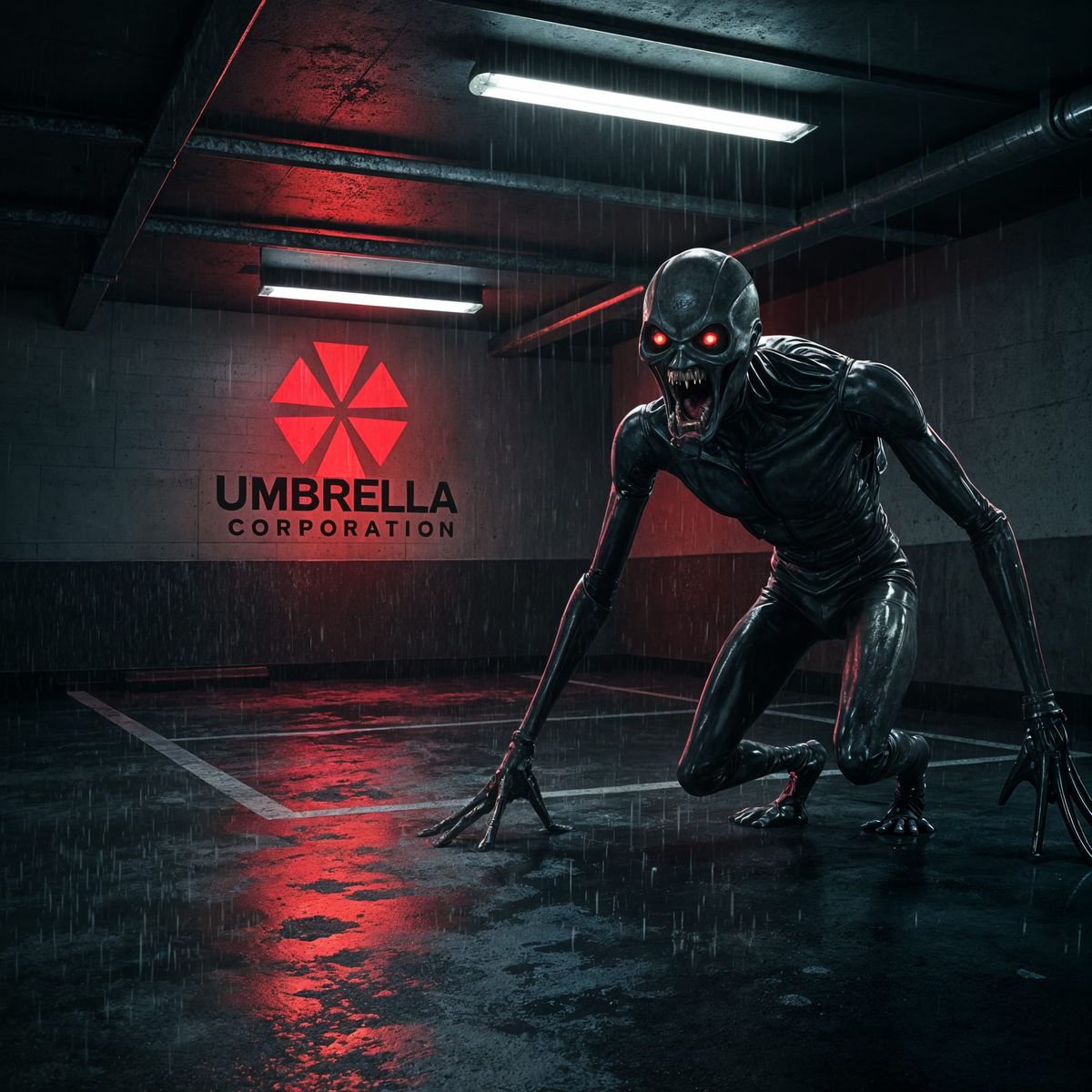 A chilling image of an underground parking lot with wet cement and cold red lighting. The Umbrella Corporation logo and a Licker from Resident Evil add to the eerie atmosphere.