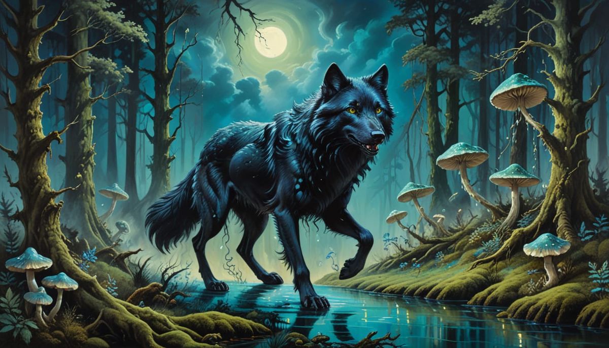 This image shows a majestic black wolf spirit with emerald eyes running through a forest under blue moonlight. Luminescent mushrooms and moss add to the surreal atmosphere, rendered in an oil on canvas style.