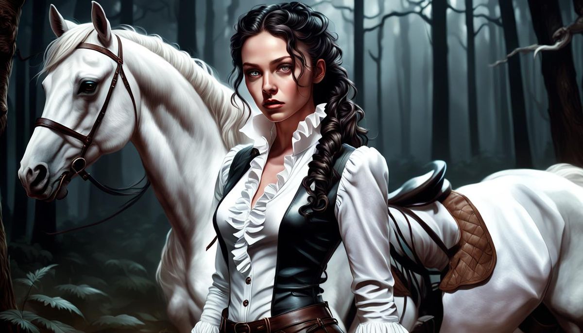 A striking picture of a woman with long black hair on a path in a dark forest. She wears a white shirt, leather gloves and boots, and white leather trousers, standing next to a white horse, rendered with hyperrealistic detail.