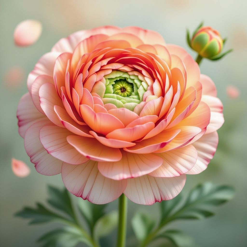 A watercolor painting of a ranunculus flower in full bloom with coral and peach petals blending into blush and cream. The image is in a botanical style with visible veins and vivid colors.