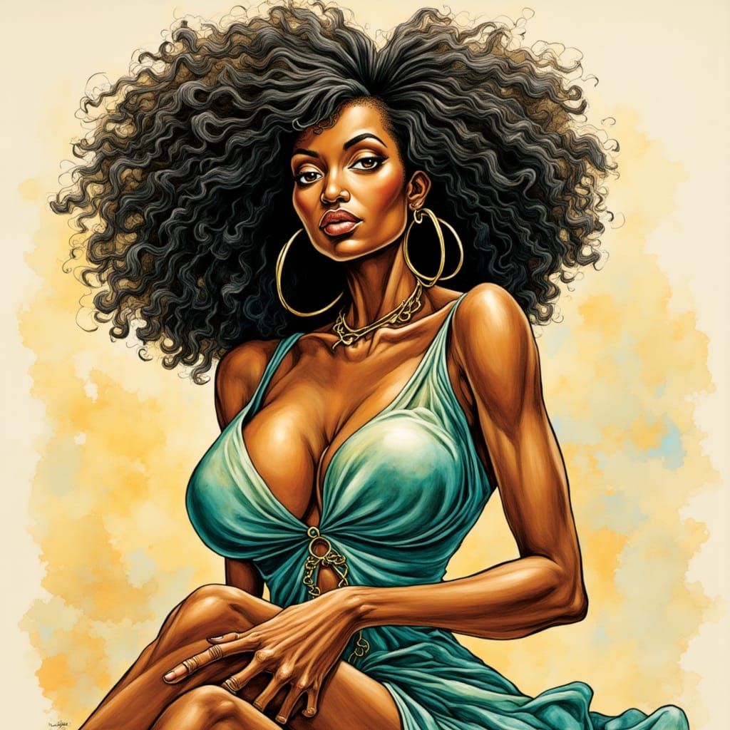 This illustration showcases a flirtatious black woman with striking eyes. Rendered in a detailed colored ink style with dynamic washes, it captures an elegant and alluring pose.