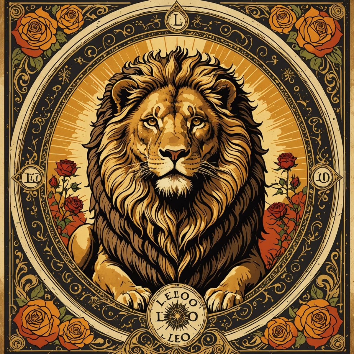 This image shows a tarot card engraving of Leo, the Lion, with a majestic mane. It features a radiant sun, roses, and flames in an antique etching style.