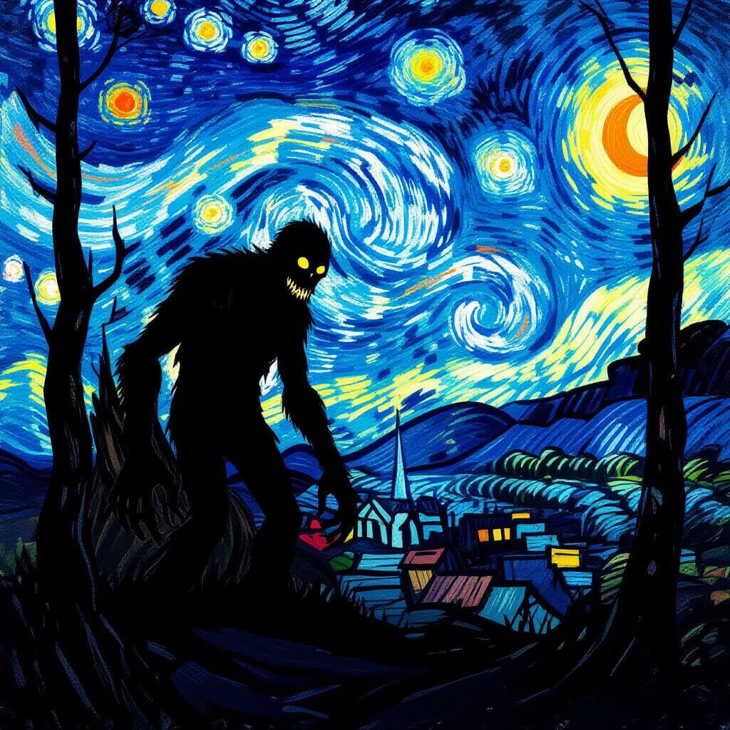 This image shows a silhouetted monster lurking at the forest's edge. The artwork evokes a pop horror style reminiscent of Van Gogh's expressive brushstrokes and dramatic use of light.
