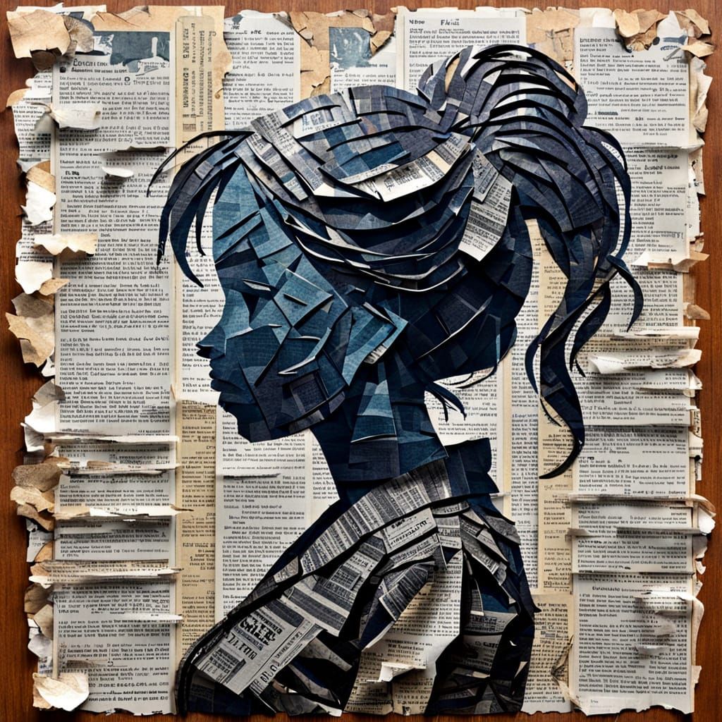 This image shows a girl's silhouette artfully crafted from recycled newspaper scraps. The monochrome palette and textured finish create a unique visual effect.