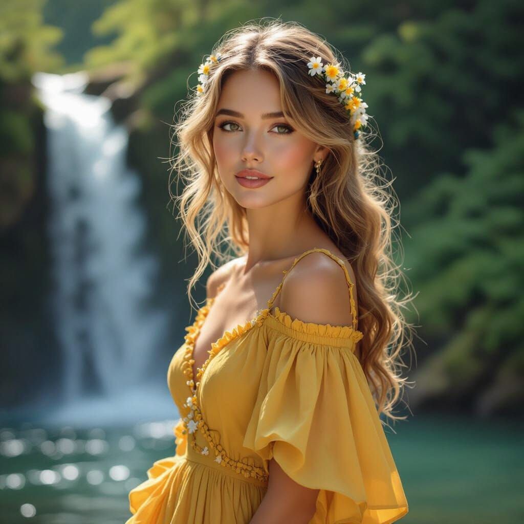 A serene European woman with flowing blonde hair adorned with wildflowers stands before a waterfall. She is wearing a light yellow dress, depicted with hyperrealistic detail in an Art Nouveau style.