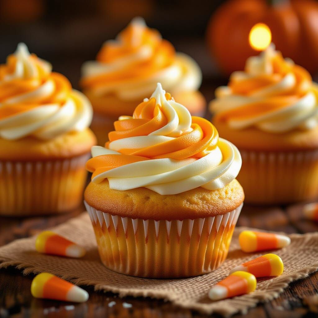 This photorealistic image showcases a gourmet Halloween muffin with orange and white swirls. Captured with a shallow depth of field and warm lighting, it highlights edible artistry.