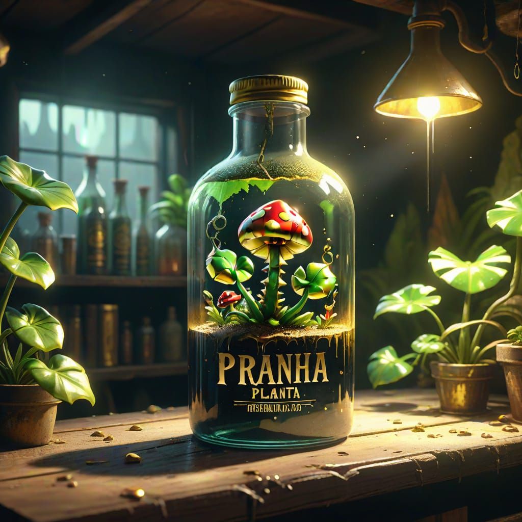 In the dimly lit corner of an ancient wizard's potions shop, a peculiar glass bottle rests on a dusty, top shelf. The bottle contains a vibrant green Piranha Plant with sharp teeth, its leaves shimmering under the warm, flickering light of an enchanted chandelier. The bottle is adorned with ominous gold ...