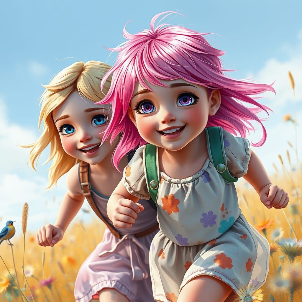 This image shows two happy girls, one with pink hair and violet eyes, the other blonde with blue eyes, running through a field. Rendered in a vibrant watercolor concept art style with dynamic lighting.