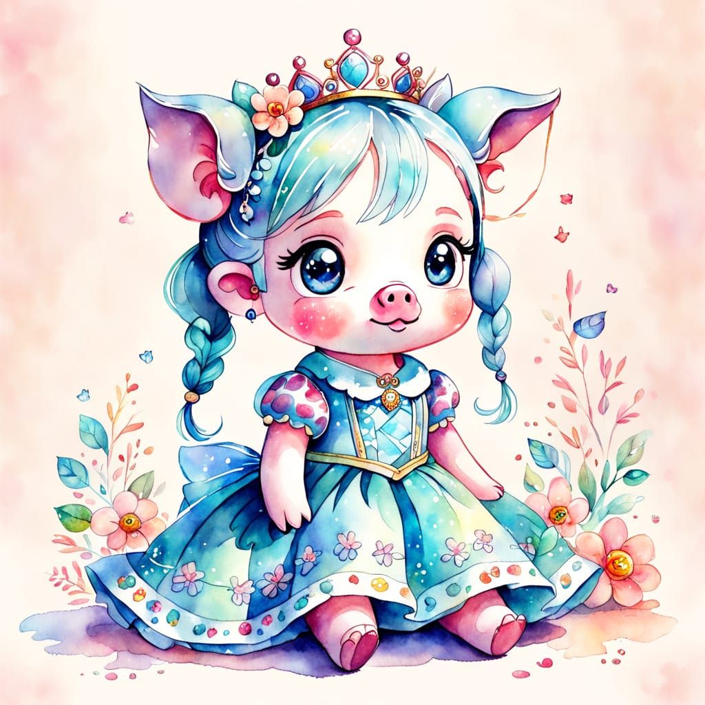 A vibrant watercolor sketch of a cute, cartoon-style princess pig toy. The full-length portrait features pastel colors, sparkling eyes, floral patterns, and soft lighting in a dreamy, youthful fantasy setting.