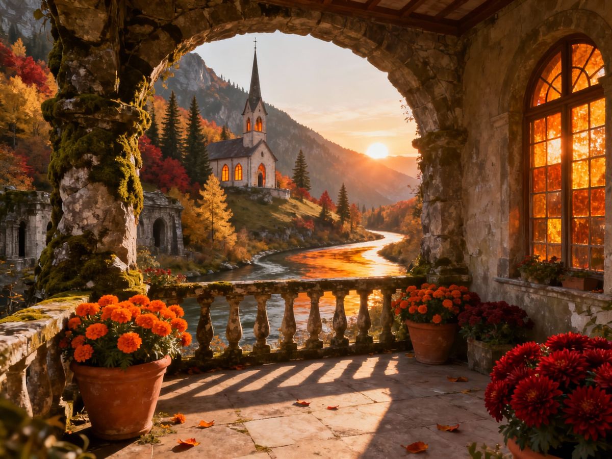 This photorealistic image captures a serene mountain valley bathed in golden hour light. View from a stone archway reveals a cozy Alpine church amidst vibrant autumn foliage and a winding river.