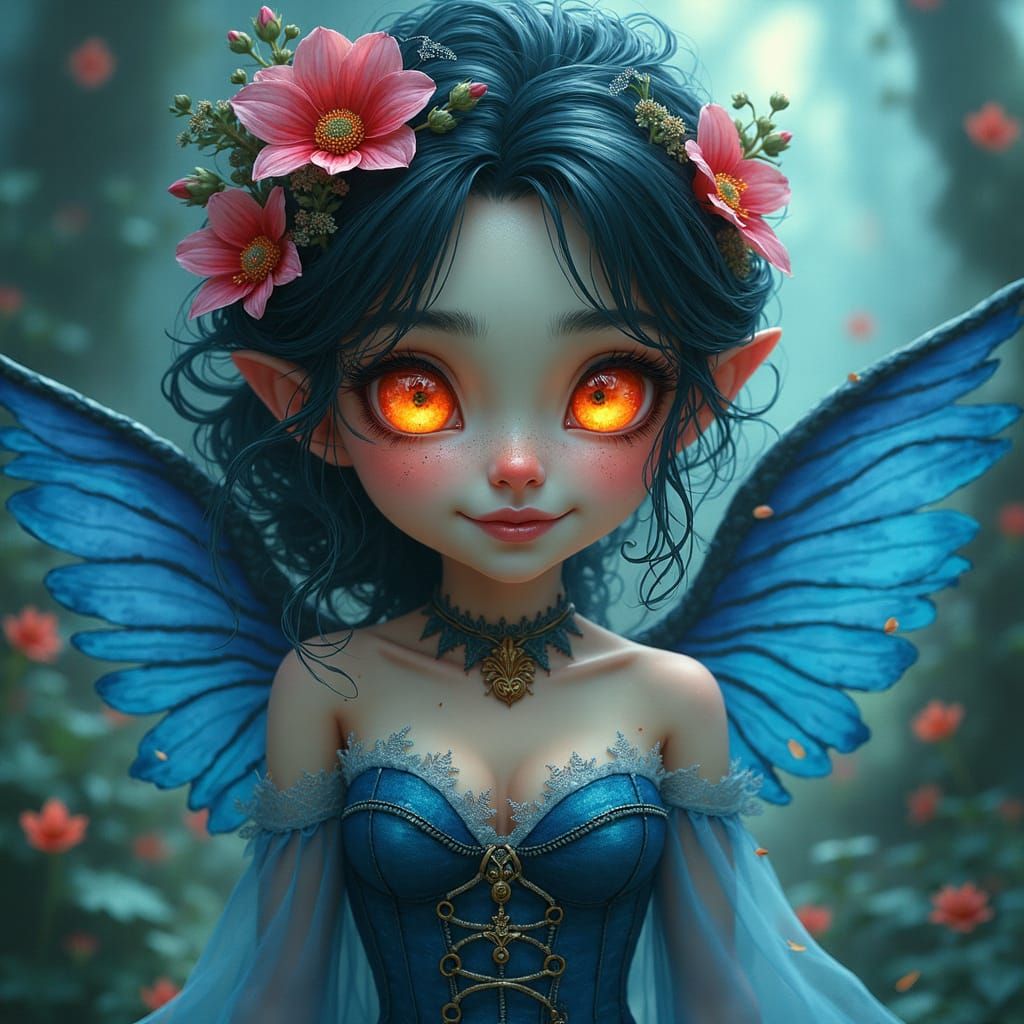 A striking picture of a soul-harvesting enchantress with fiery eyes. She wears a shimmering corset and seaweed-like hair, with wings that seem to echo screams. The image is in a vibrant, whimsical fantasy style.