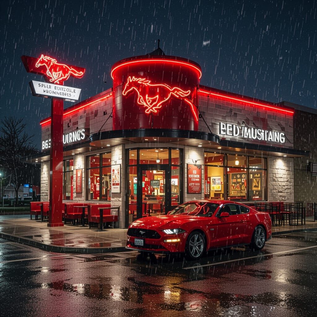 This image depicts an American burger restaurant with a red and white theme, featuring a red Mustang parked outside on a wet, rainy night.
