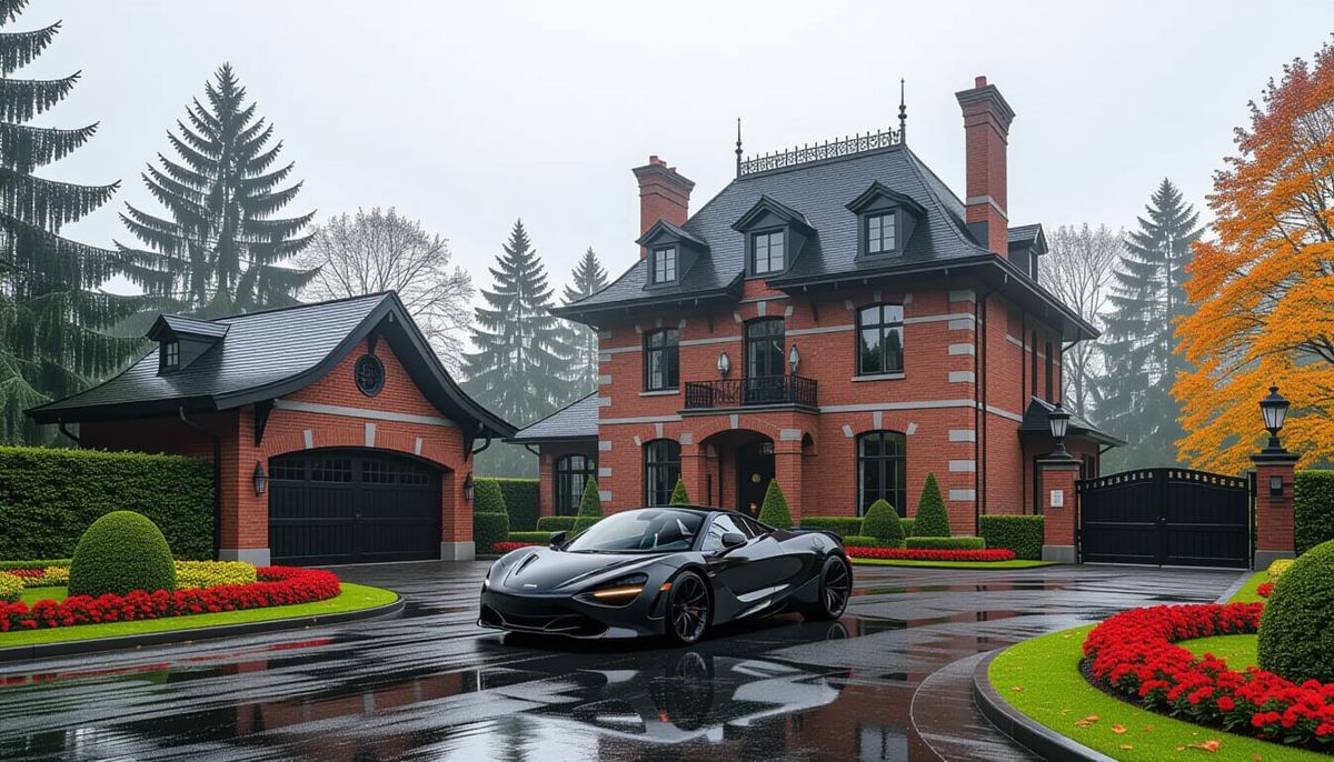 This image shows a grand Victorian chateau and a black McLaren 720S parked in heavy mist. Features vibrant trees, a flower garden, and rainy skies, rendered with painterly realism and visible brushwork.