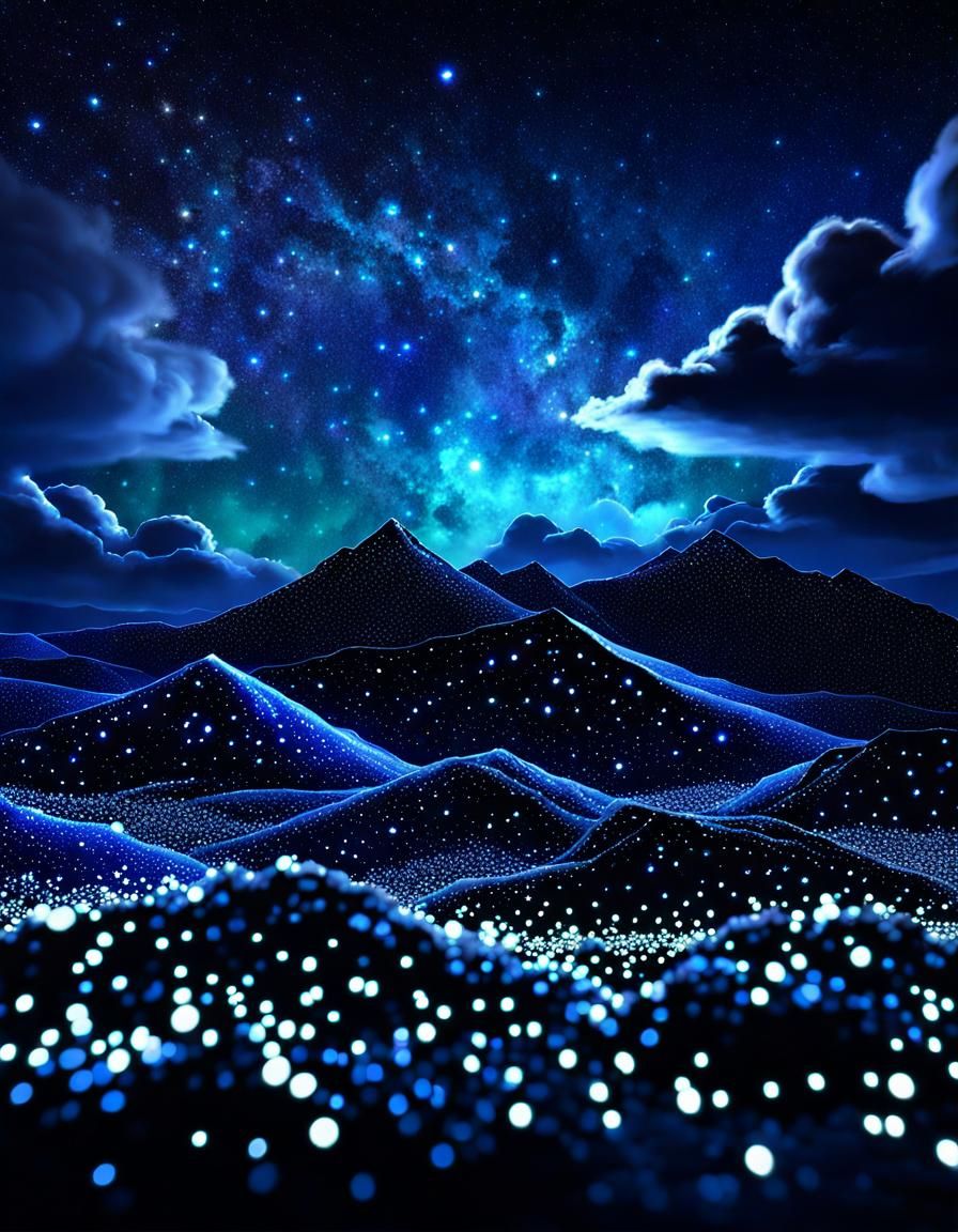 This image shows a sparkling, bejeweled fantasy scene with volumetric magical lighting and rich colors. Intricate details are set against a bioluminescent night sky with starry constellations, nebulas, and bokeh effects in black and royal blue.