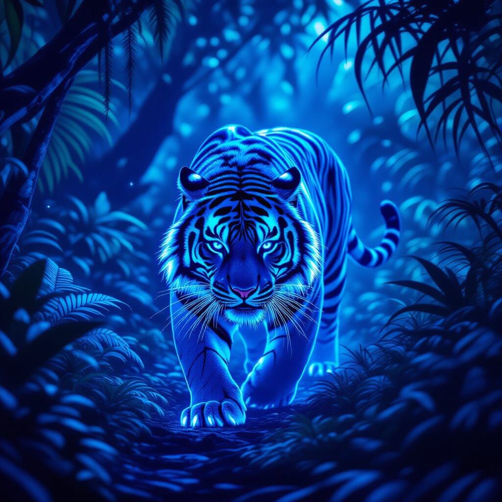 This image features a glowing blue tiger in a dark, exotic jungle. The artwork is in a futuristic fantasy style with vivid, contrasting colors and dramatic lighting.