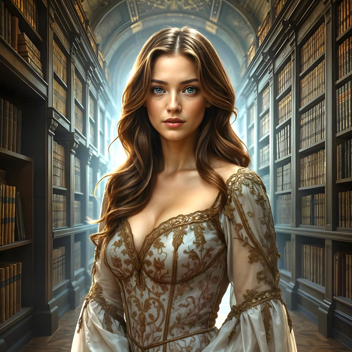 This image shows a stunning woman with flowing brown hair and blue eyes in a library. The portrait features idealized naturalism and atmospheric depth, reminiscent of art nouveau.