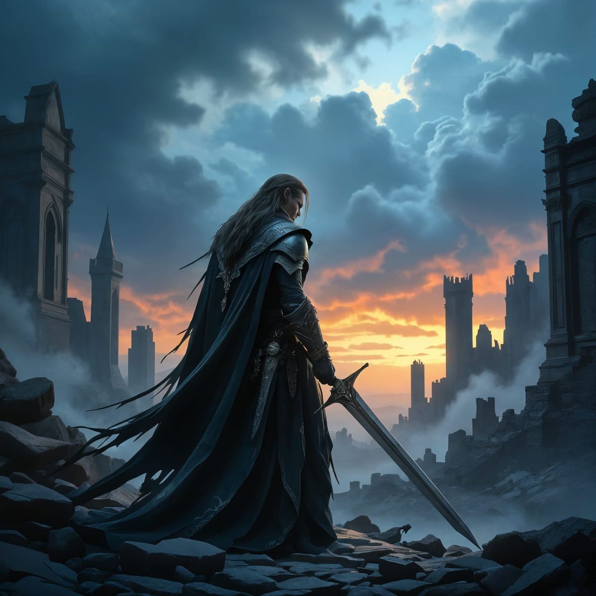 A lone male elf in torn royal robes stands in the ruins of an elven city, holding a broken sword. The scene features cinematic lighting and a dramatic sky, evoking an epic fantasy atmosphere.