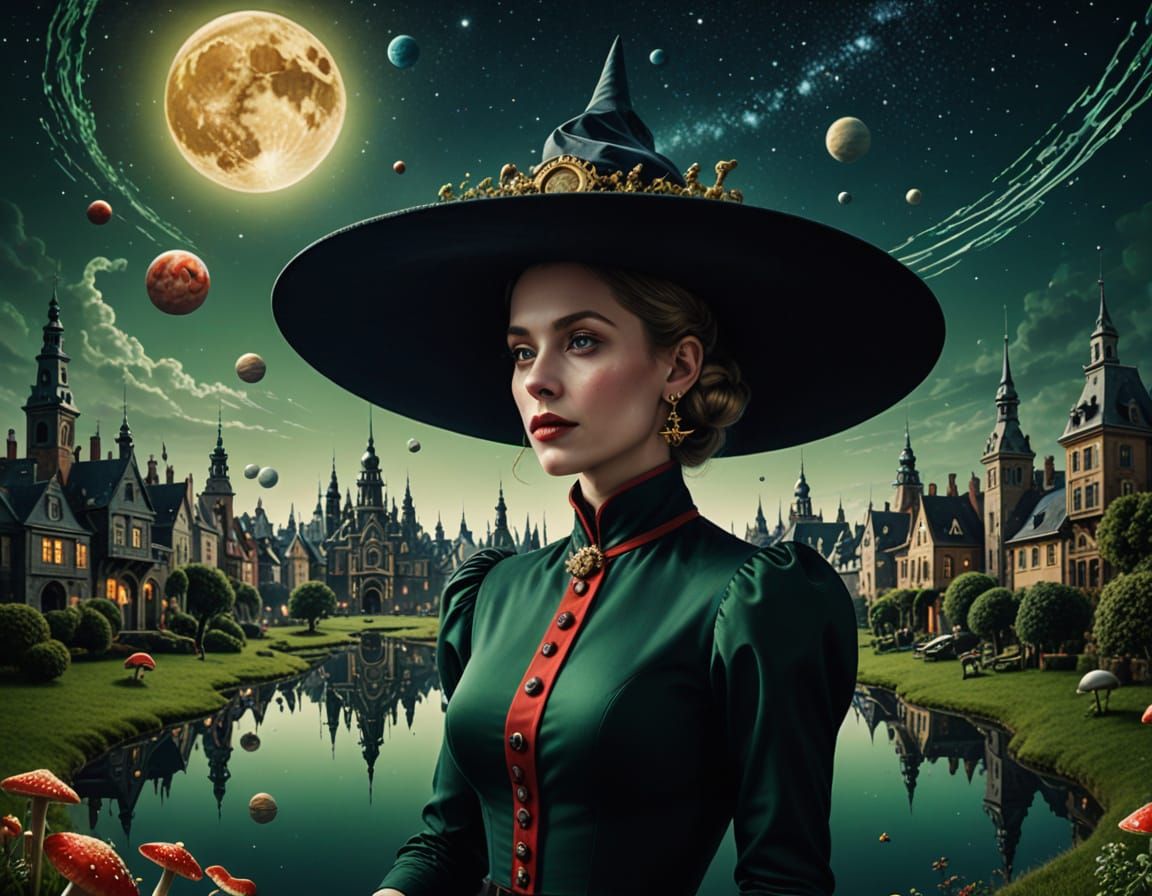 This image shows a surreal cityscape composed of the Milky Way reflected in water under a green night sky. The composition features oversized objects and asymmetrical arrangements in the style of Hieronymus Bosch.
