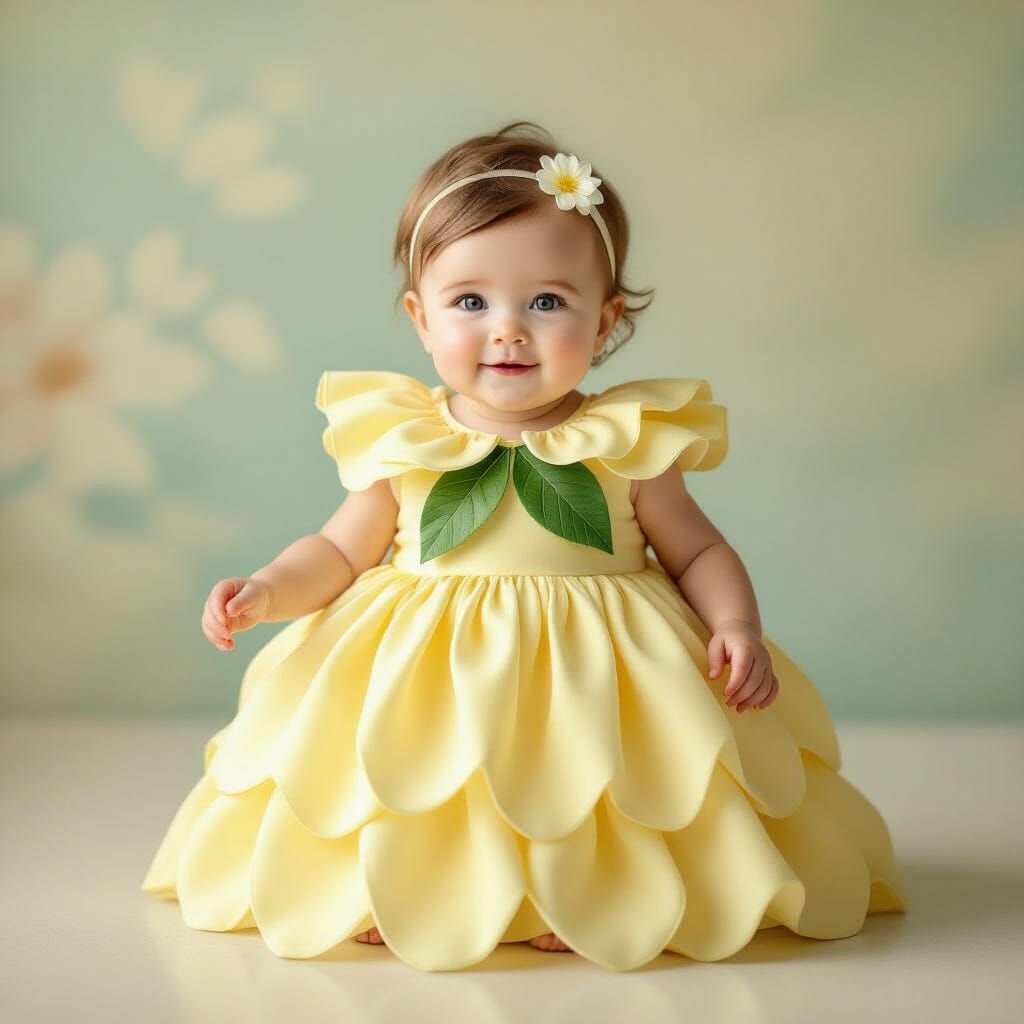 A captivating image of a baby in a jasmine gown. The baby is centered, bathed in soft daylight against a pastel backdrop, rendered with hyperrealism and smooth forms.