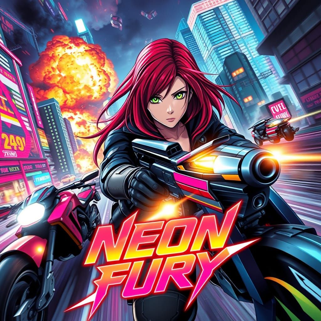 This image shows a determined anime woman with long red hair amidst a chaotic cyberpunk city. Futuristic vehicles race through neon-lit streets, with explosions lighting up the skyscrapers in this cinematic action scene.
