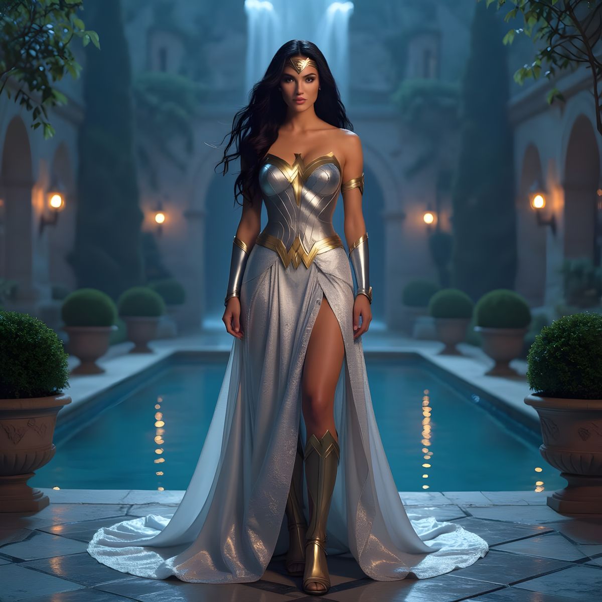 This image shows Wonder Woman in a silver and gold lace dress with a diamond tiara, posing in front of a castle. The scene is set at nighttime with a reflecting pool and waterfall.