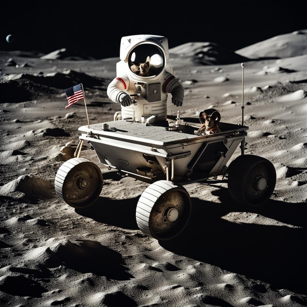This image shows a mouse and an alien driving a lunar rover on the moon under dramatic nighttime lighting. The scene captures a whimsical, otherworldly adventure.