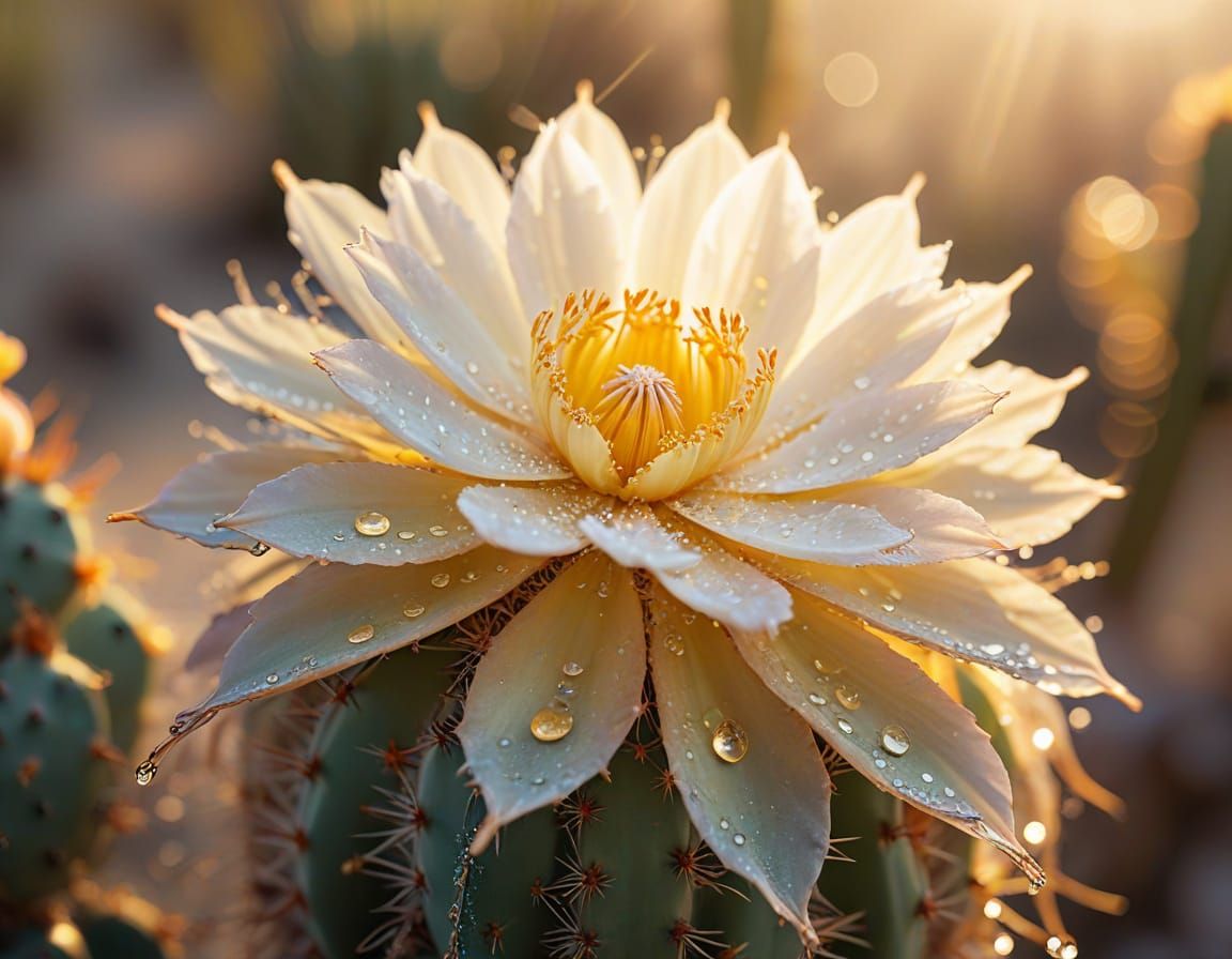 This image shows a macro photograph of a blooming pink cactus flower. Translucent petals catch the sunlight in a dreamy, soft focus desert scene with gentle colors. The aesthetic is ethereal impressionism.