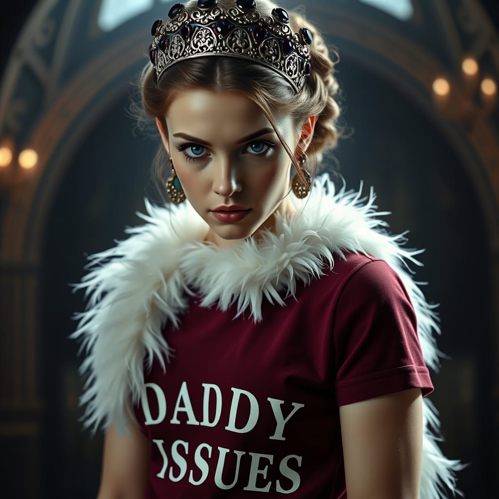 This image shows a rebellious princess with a striking gaze, slouching in a dramatic scene. She wears a burgundy T-shirt with a bold message, an art nouveau tiara, and a white boa, blending elements of gothic elegance and dark romance.