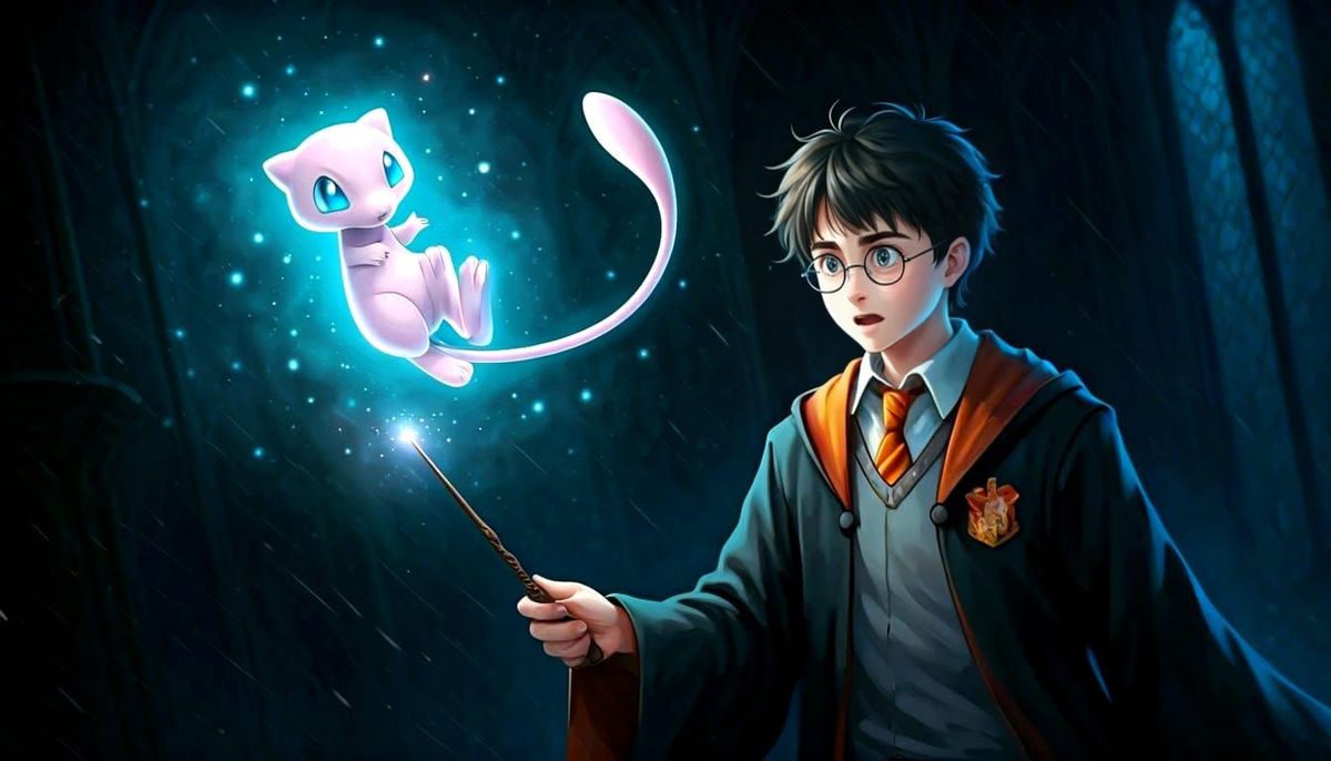 A whimsical anime-inspired image shows Harry Potter astonished as he accidentally summons Mew with his wand, the Pokémon floating playfully in mid-air.