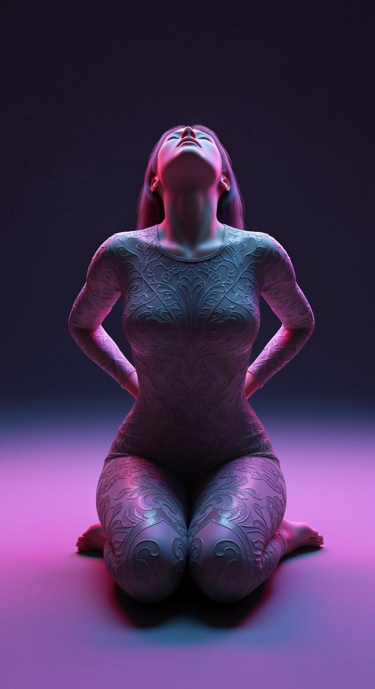 This image shows a woman in an ecstatic pose, sitting on the floor wearing elegant attire. The scene is illuminated with dynamic lighting and rendered with detailed textures in an art nouveau style.