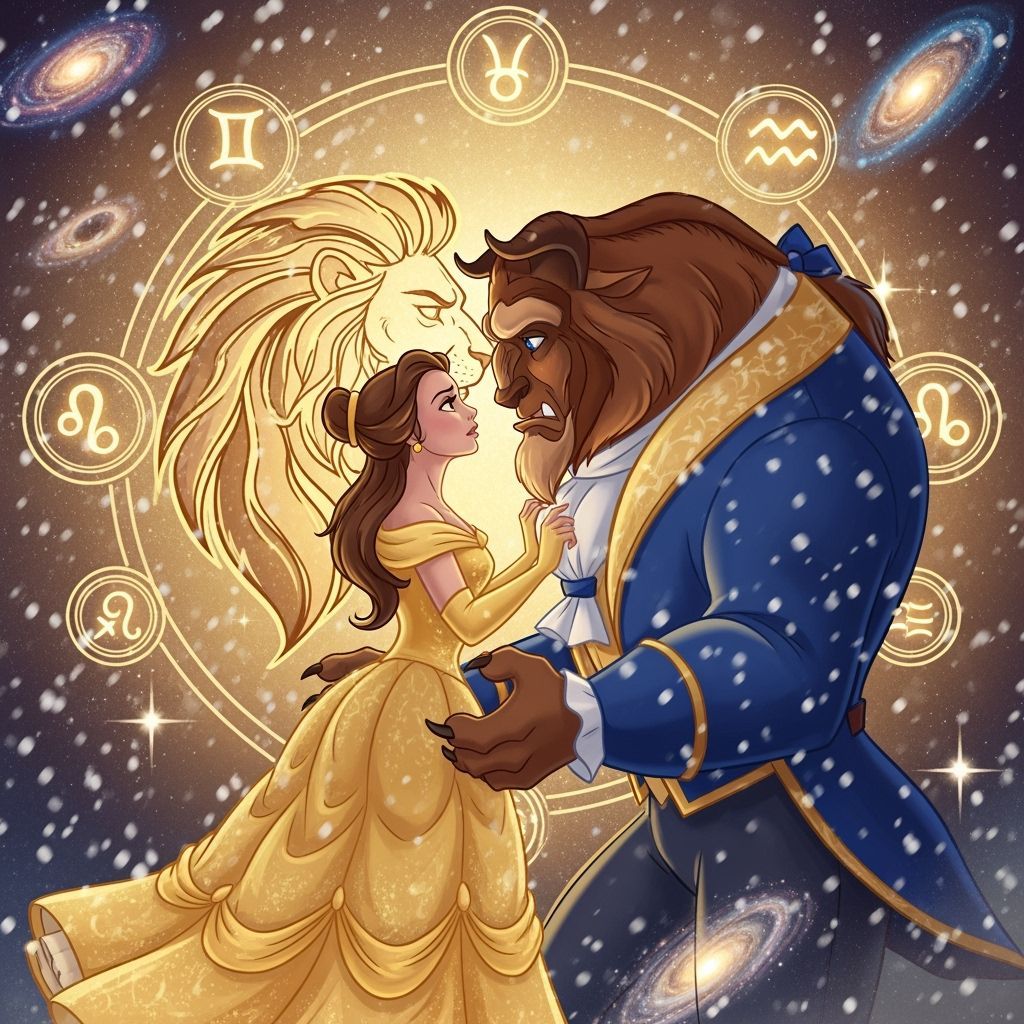A digital illustration inspired by Disney shows Belle in a golden gown confronting the Beast. The image shows falling snow, zodiac signs, and a dreamy, galaxy-filled scene with gold colors.
