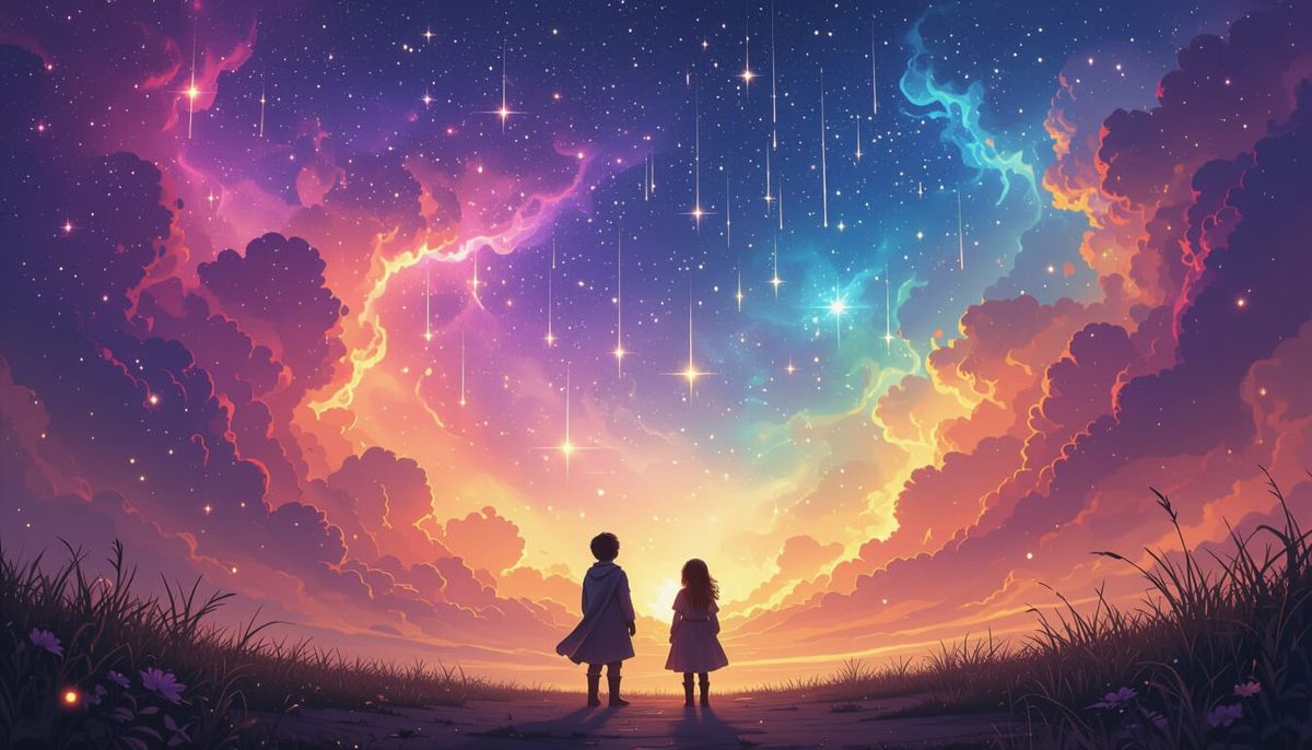 This image showcases a vibrant digital painting of a cosmic nebula with a starfall, viewed from below, with two children in medieval attire gazing up in awe.