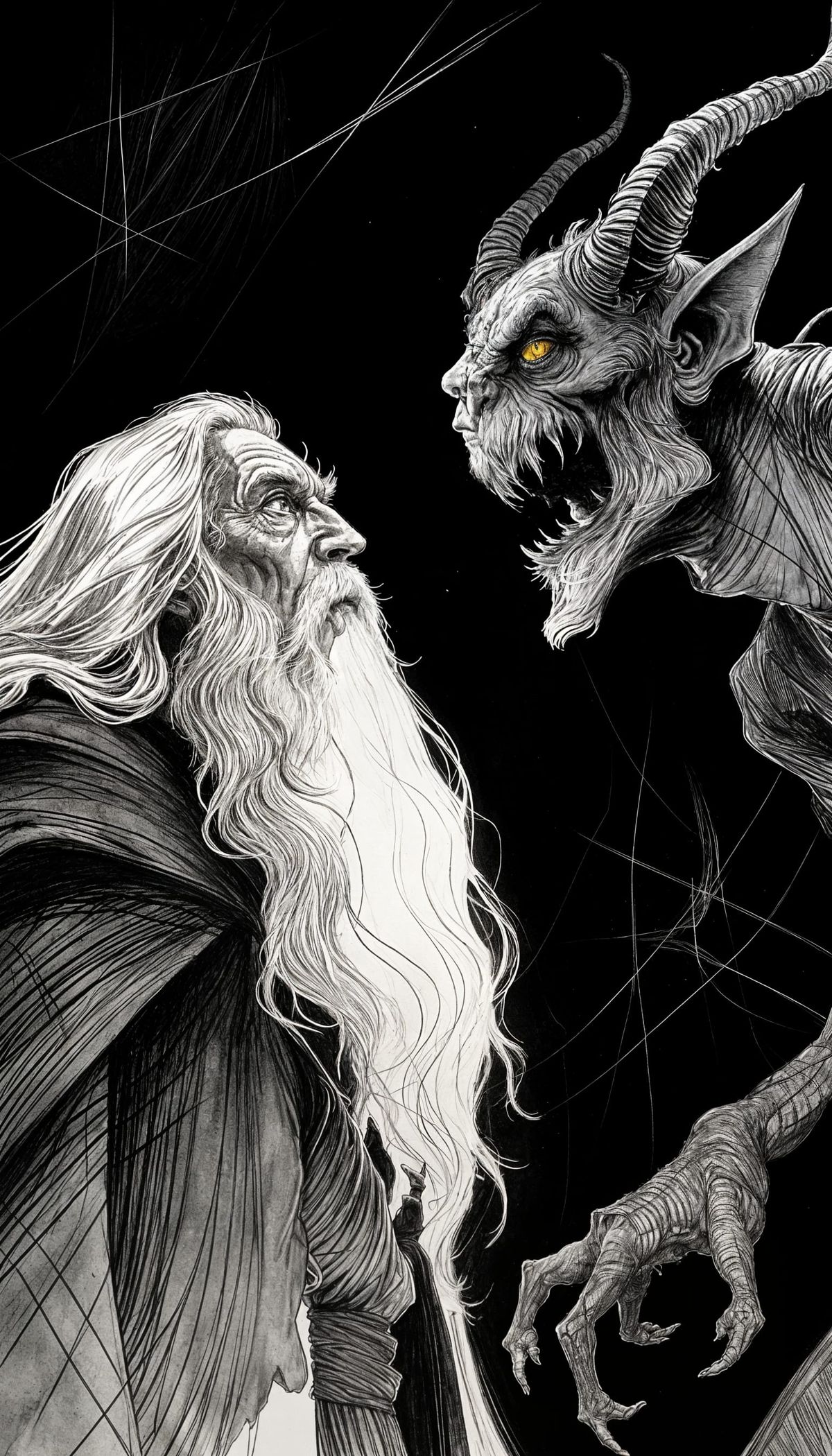 This image depicts a dramatic confrontation between a wizard and a demon, rendered in a gritty, high-contrast illustration style with deep shadows and watercolor effects.
