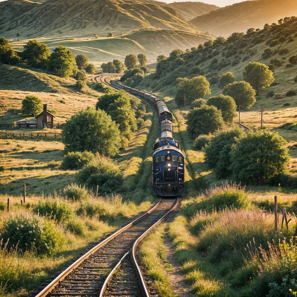 This image shows a train traveling through a rural landscape. The train is depicted in motion, surrounded by fields and countryside scenery.