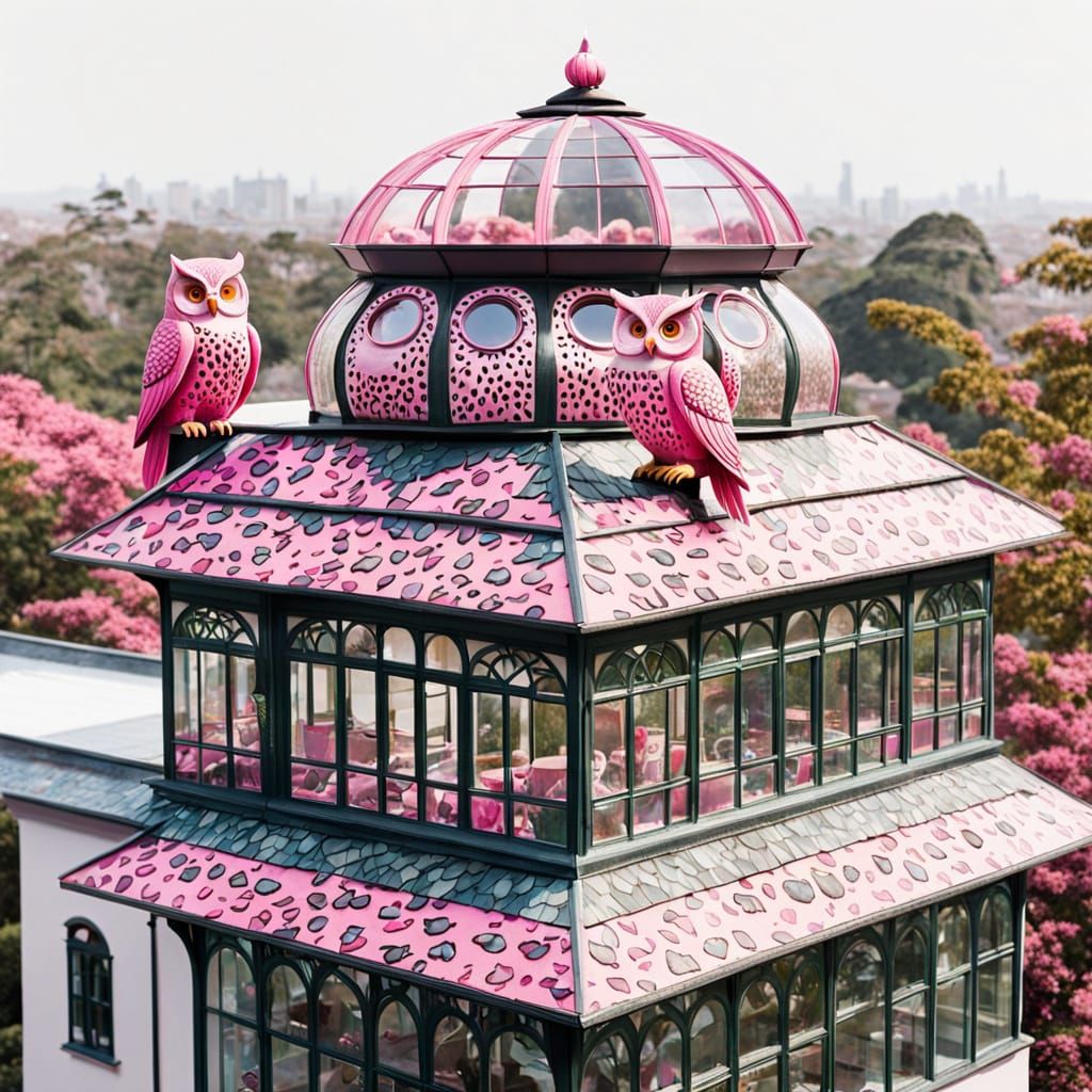 This AI-generated image depicts a unique palace made of leopard-print glass, with whimsical pink owls perched on its roof.