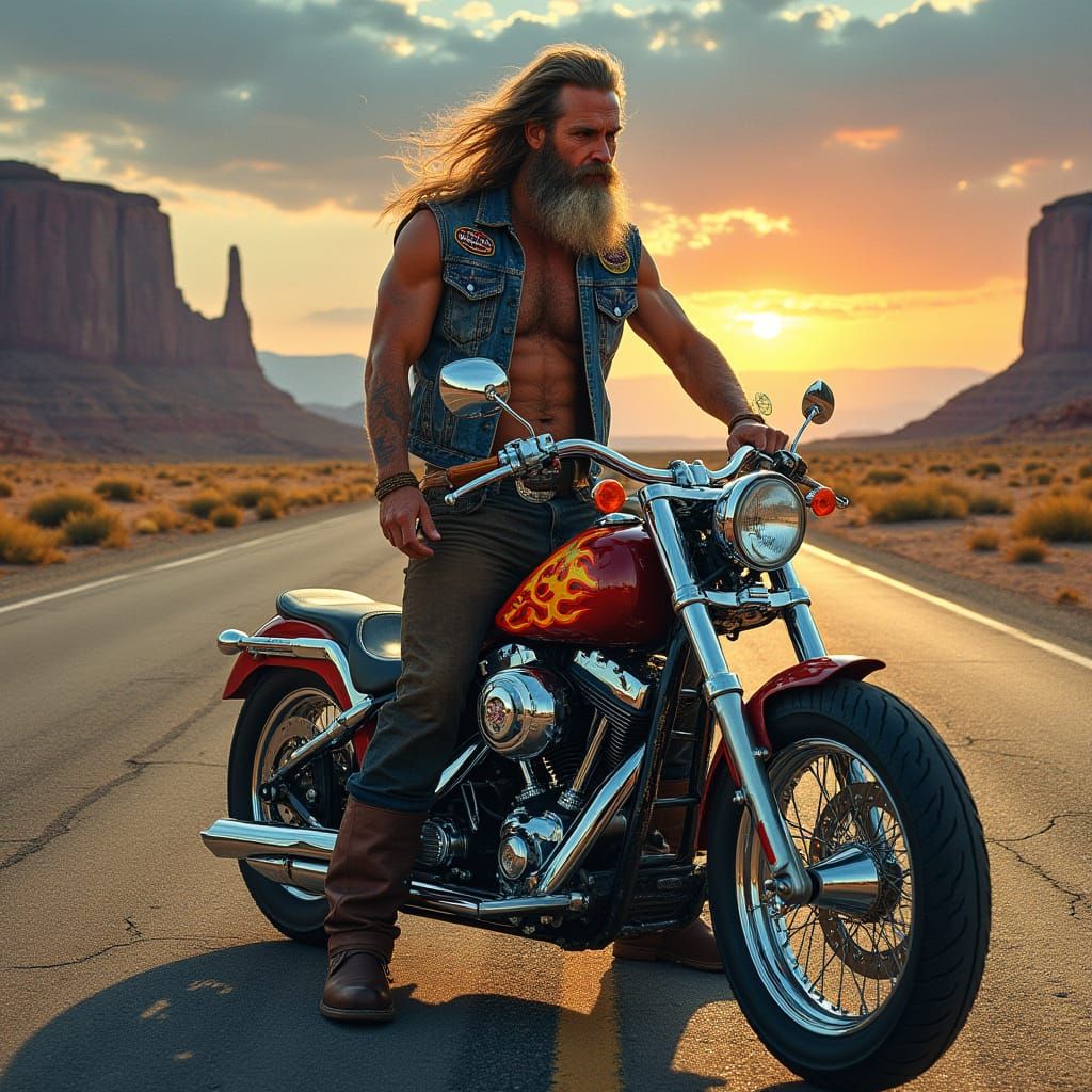 A defiant biker stands beside his customized 1960s Harley Davidson chopper, adorned with chrome pipes and a vibrant flame design, against a backdrop of desert mesas and a blazing orange sunset.