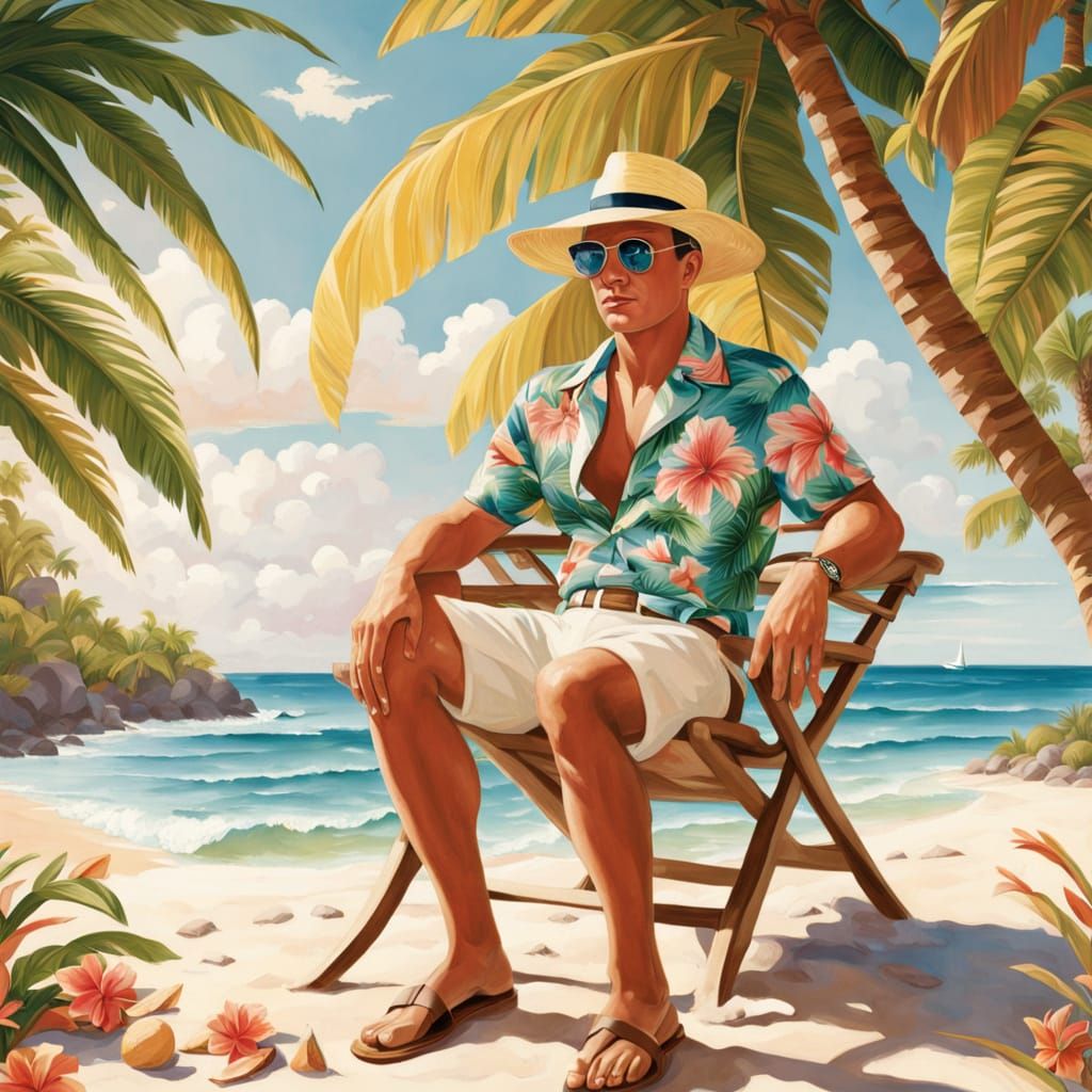 This image shows a man relaxing on a tropical beach at sunset. The vibrant, photorealistic scene evokes a sense of relaxation and paradise, reminiscent of vintage travel posters.