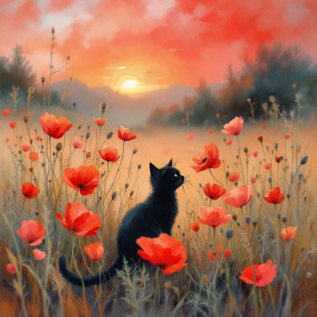 This image shows a black cat in a poppy field at sunrise. The artwork is reminiscent of impressionist landscapes, with watercolor effects and expressive brushstrokes, creating a dreamy and ethereal scene.