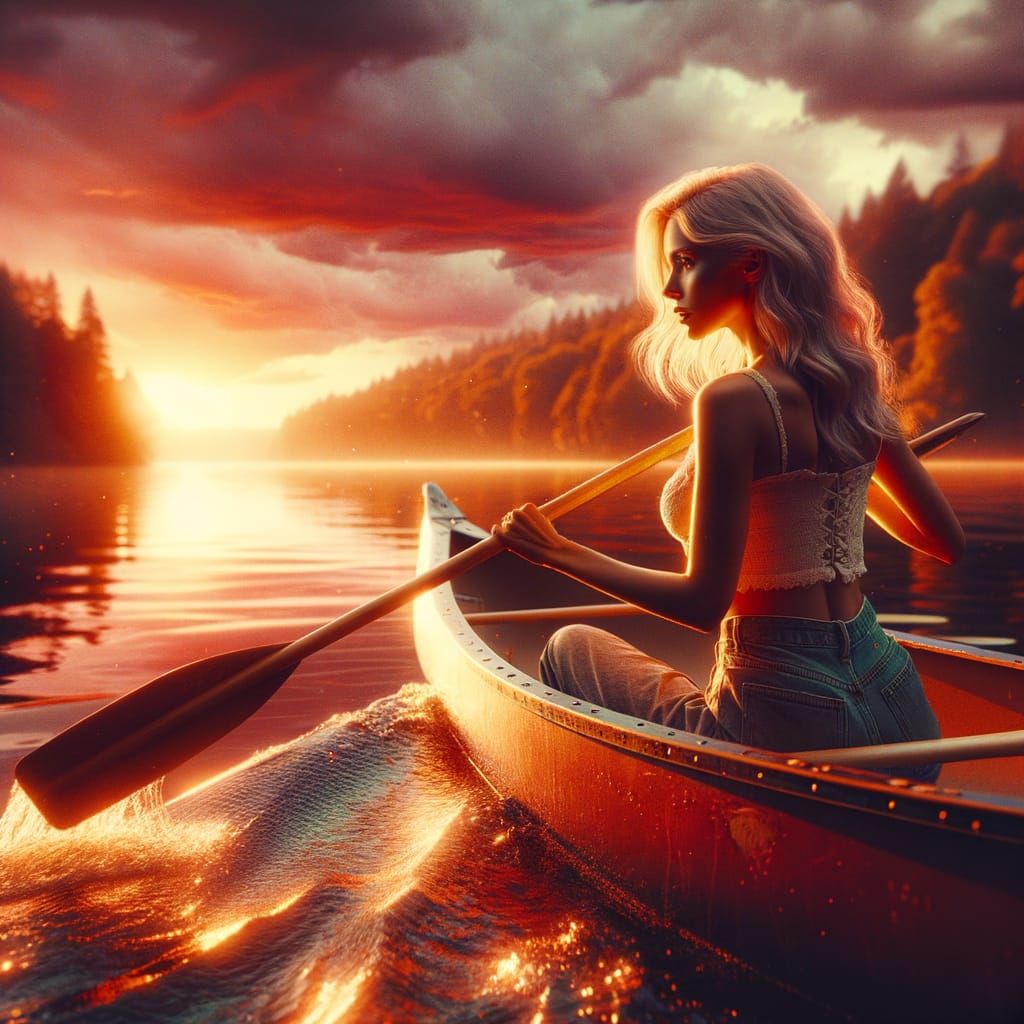 This image captures a serene moment on a serene lake, where a woman paddles her canoe as the setting sun casts a warm, rosy glow across the scene, evoking a cinematic atmosphere.