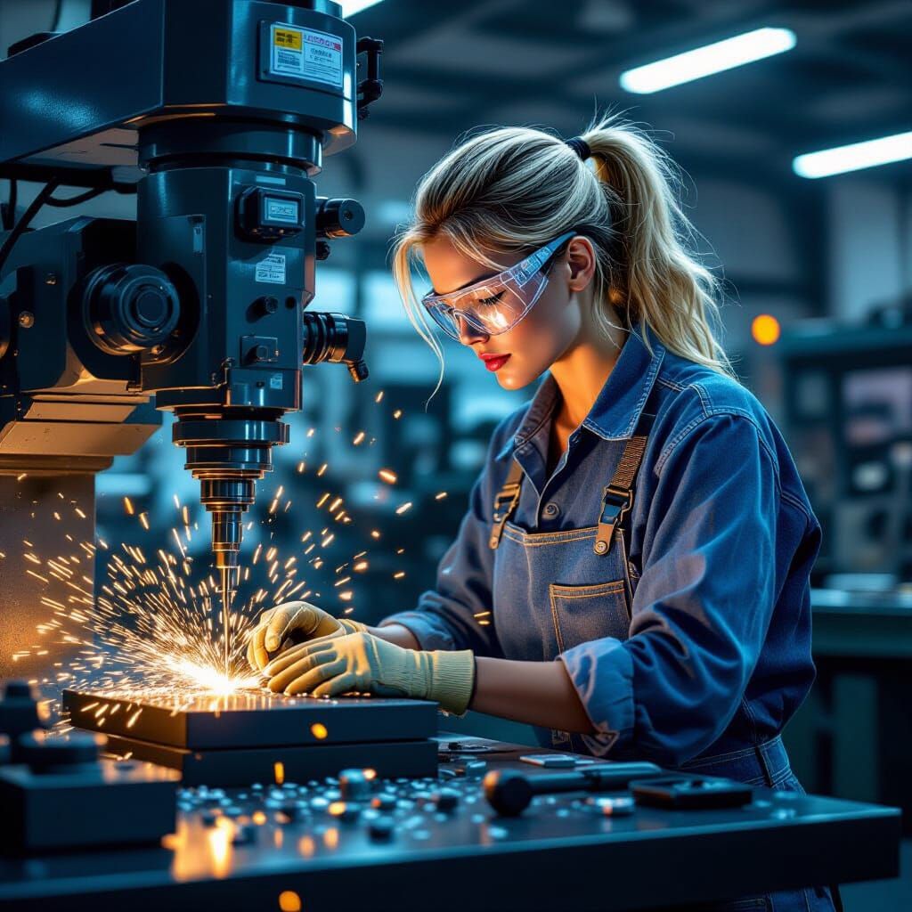 This image shows a focused female machinist with blonde hair operating a milling machine in a busy shop. Sparks fly as she works, with tools and machinery visible. Rendered in a vibrant digital illustration style with dramatic lighting.