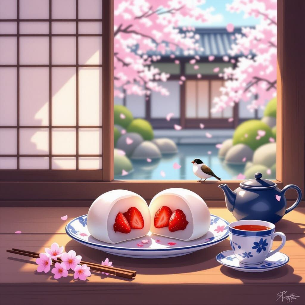 This image shows a halved strawberry mochi on a Japanese plate, with a teapot and cup on a wooden table. Cherry blossoms are visible through a window in the anime style.