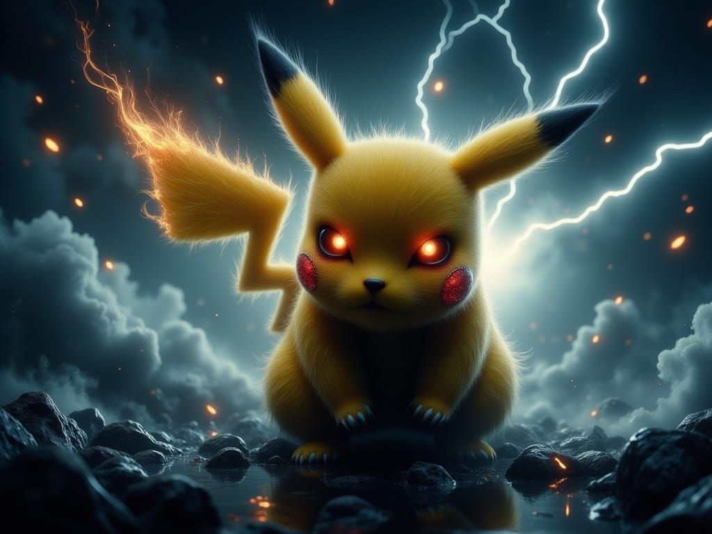 A horror-themed image of Pikachu summoning a lightning storm. The image features dark, cloudy skies and a flash flood, rendered in a realistic and detailed style.