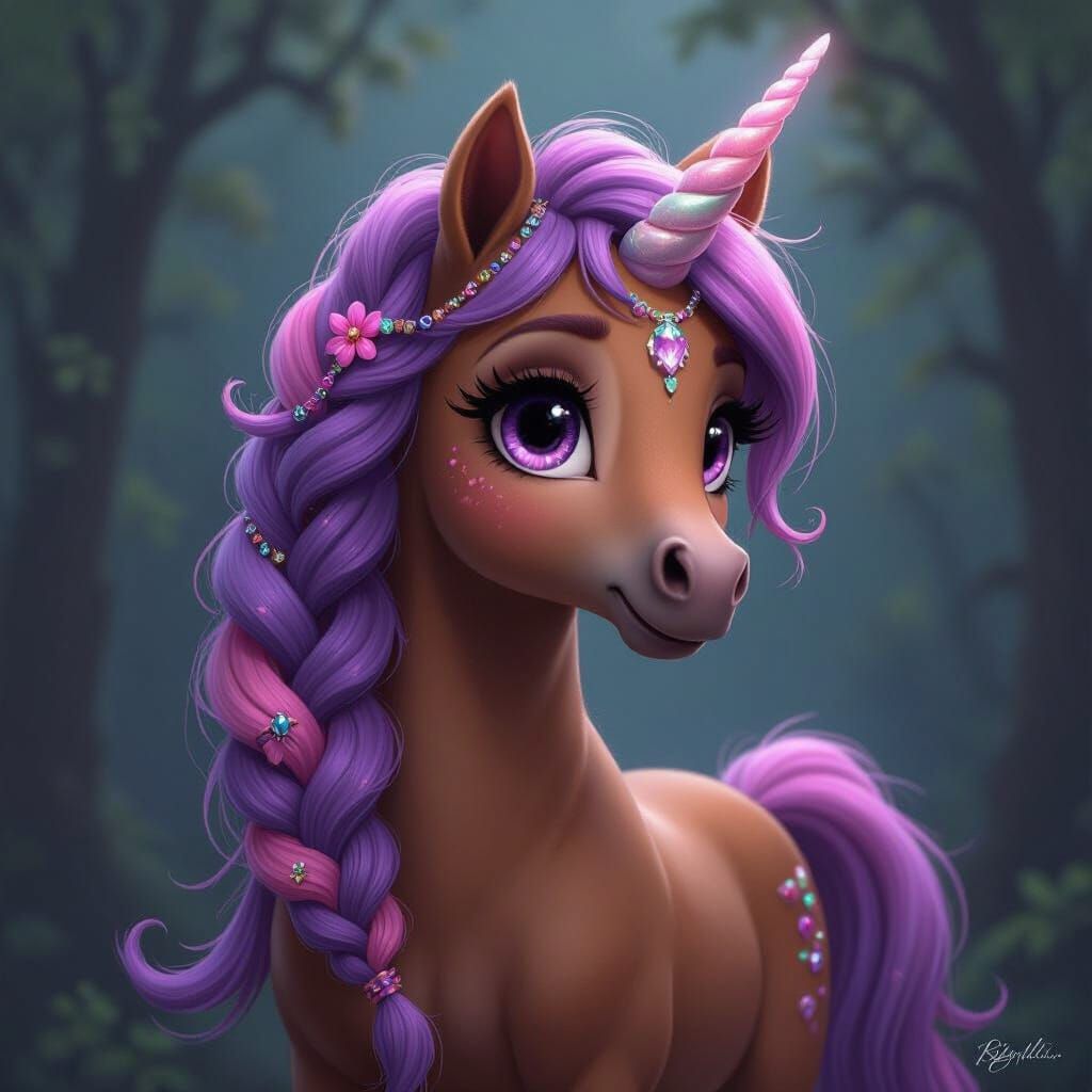 This detailed matte painting showcases a majestic unicorn with a sleek brown coat, braided lavender and fuchsia mane, and sparkling adornments. It features large expressive eyes and a crystal horn, evoking a magical fantasy concept.